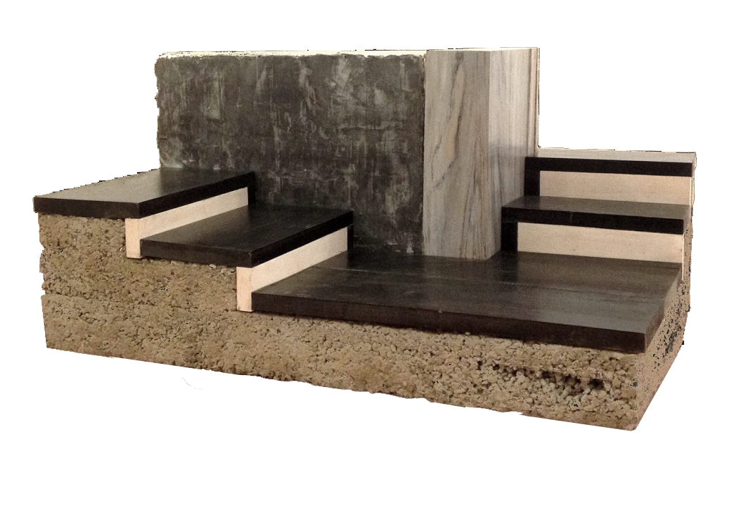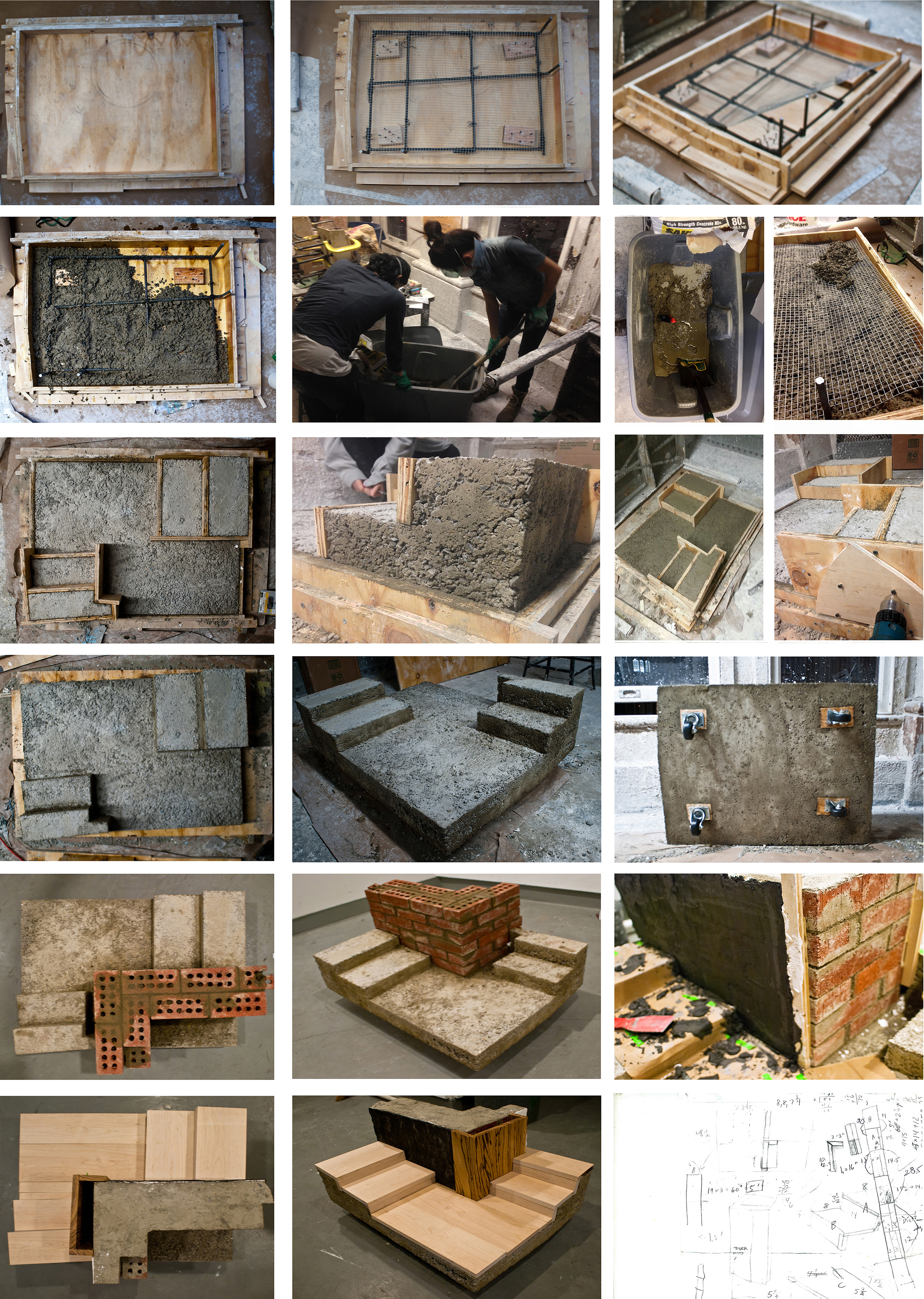 A wooden jig. Concrete mixing. Concrete Pouring. Bricks. Plaster. Marble, the menagerie of materials.